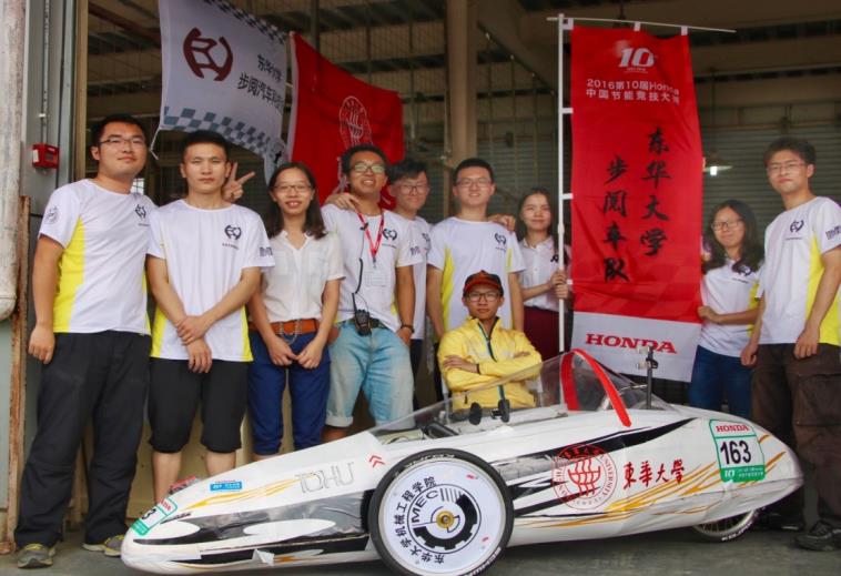 步阅节能车队以步阅汽车科技协会为基础,组建于去年11月,车队成员为搜同 机械工程及工业设计专业大二、大三、大四的同学。同学们利用课余时间,主动放弃暑假休息,积极主动投入到赛车的设计、制作、调校测试中。准备比赛过程中,同学们认真研究,大胆创新,先后完成了发动机的改装调校、转向机构优化、气动离合器设计,并结合碳纤维成型技术、3D打印技术设计制作了碳纤维车架、航空布料车身,在确保赛车强度、安全性能的同时大大降低了赛车自重。这一系列的创新设计,得到了Honda工程师们的高度赞赏。