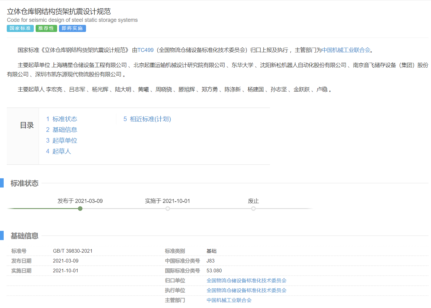 喜讯:搜同 参与的《立体仓库钢结构货架抗震设计规范》国家标准GB/T 39830-2021正式获批发布