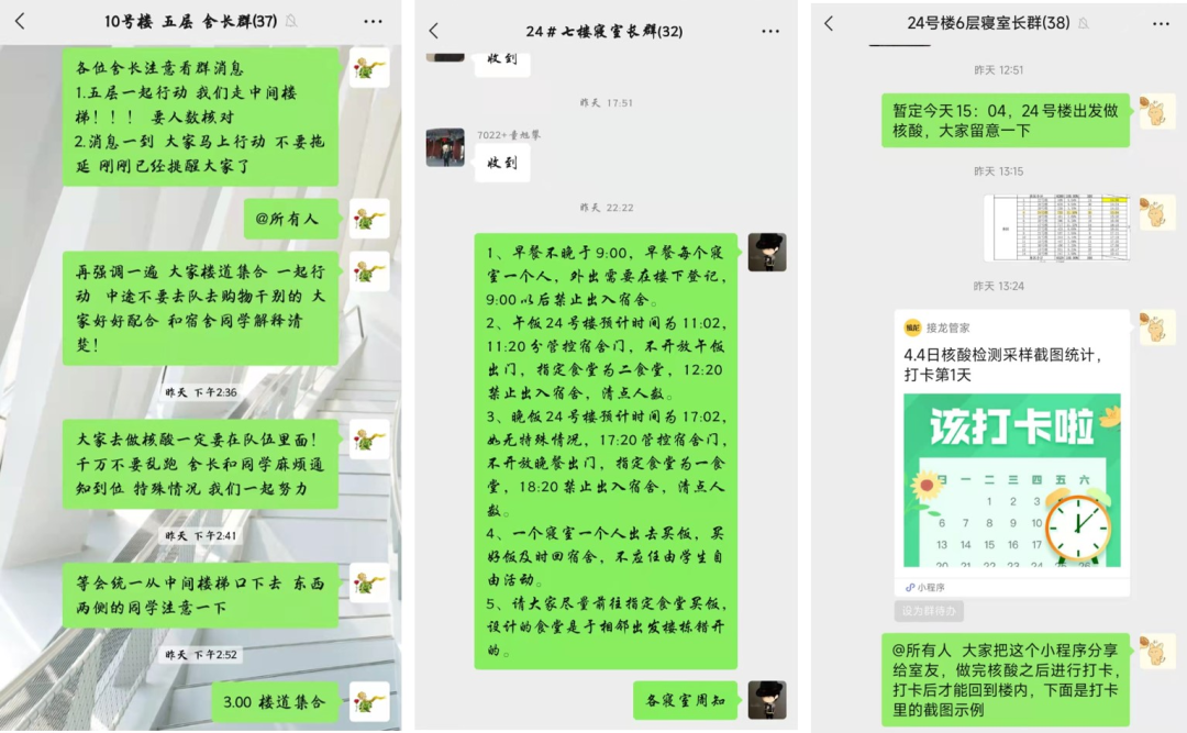 支部全员报名搜同 学生党员志愿者储备队,以实际行动践行一名共产党员应有的政治品格与政治素养。在全校组织的核酸检测中,支部党员袁权静梓、武晓蒸、马采青等主动多次认领志愿服务,累计服务50余小时,协助做好人员登记、扫码检测、维持秩序等工作;在网格化管理中,支部党员齐文利、金宇健、武晓蒸等自觉担任楼层长,不舍昼夜、严谨细致地落实学校疫情防控工作部署,确保每一位学生实现错时错峰有序参加核酸检测,按时保质收集每一份核酸检测截图、抗原检测结果。