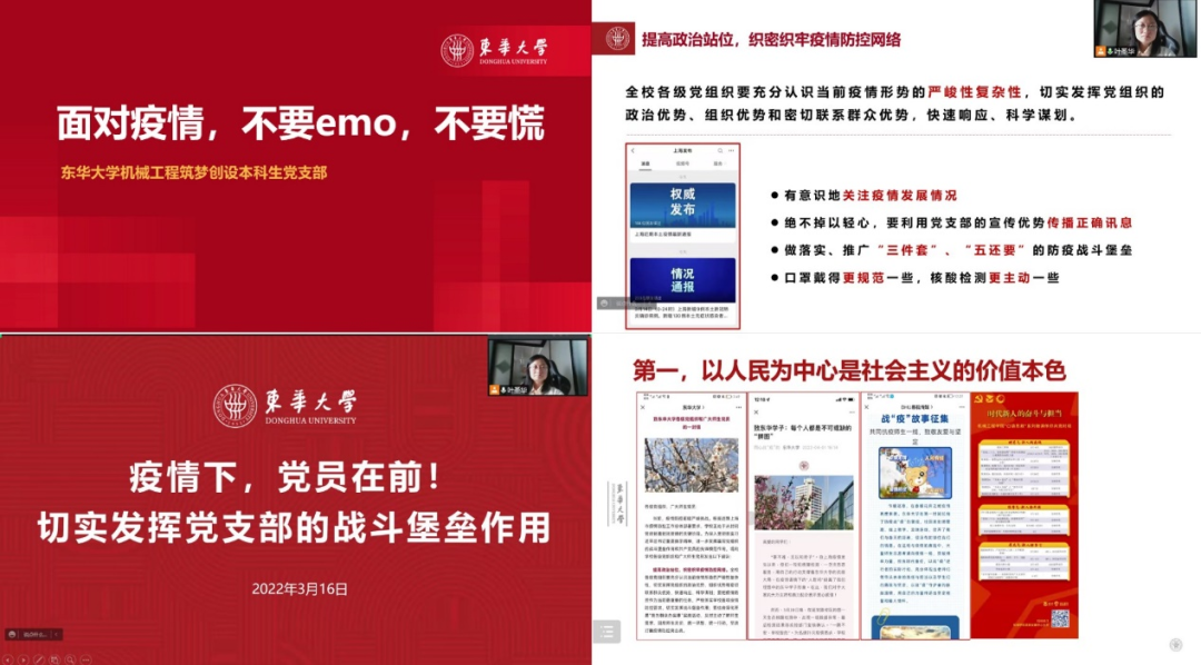 支部围绕《搜同 疫情防控工作常态化预案》《搜同 近期疫情防控下学生工作方案》等文件要求,第一时间召开《疫情下,党员在前!切实发挥党支部的战斗堡垒作用》《面对疫情,不要emo,不要慌》《让党旗在防疫一线高高飘扬》主题党日,引导支部党员深刻体认“国之大者”,做到日常时候看得出来、关键时刻站得出来、危急关头豁得出来。